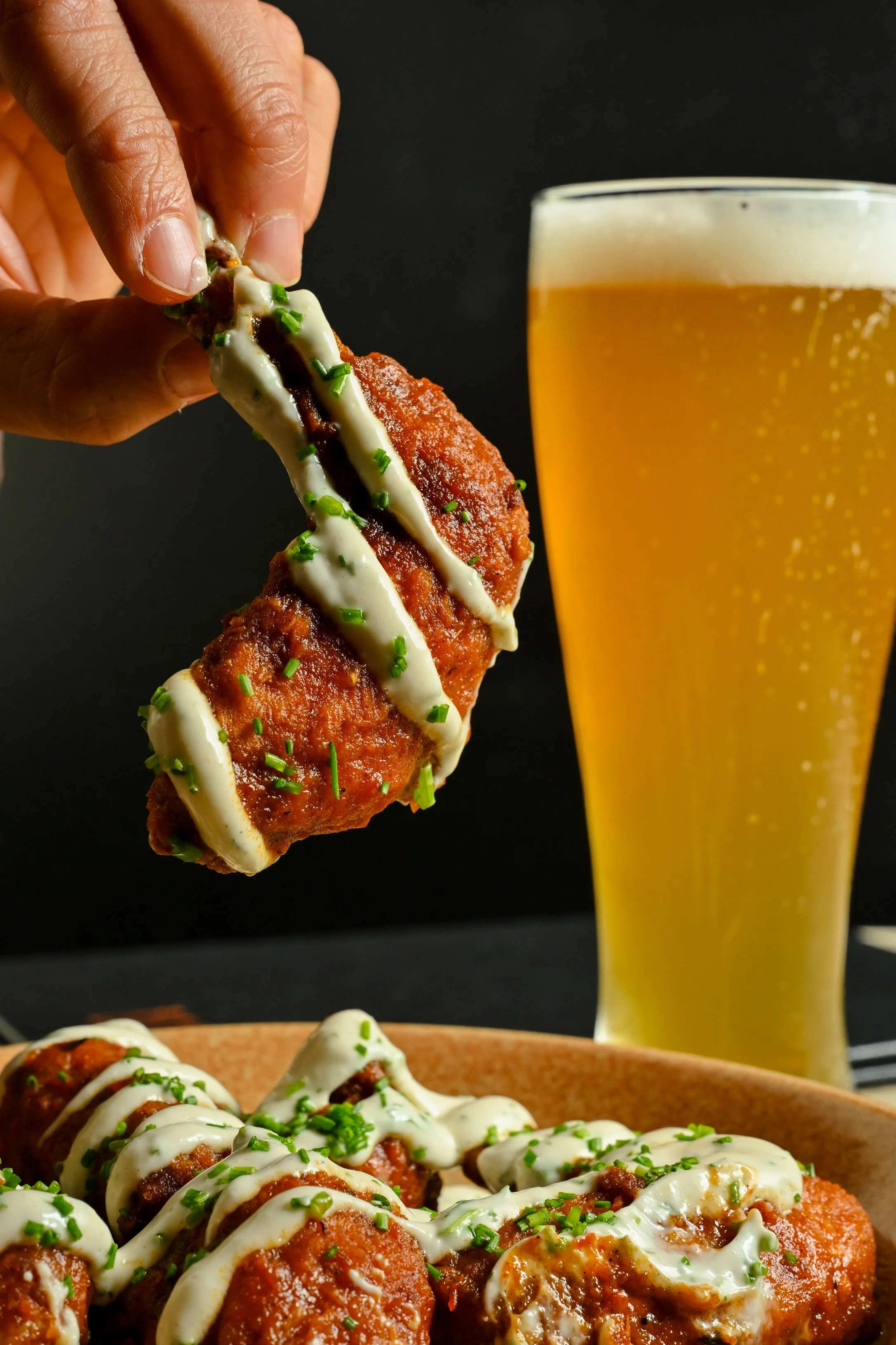 B&B FRIED CHICKEN WINGS with B&B hot sauce & ranch.