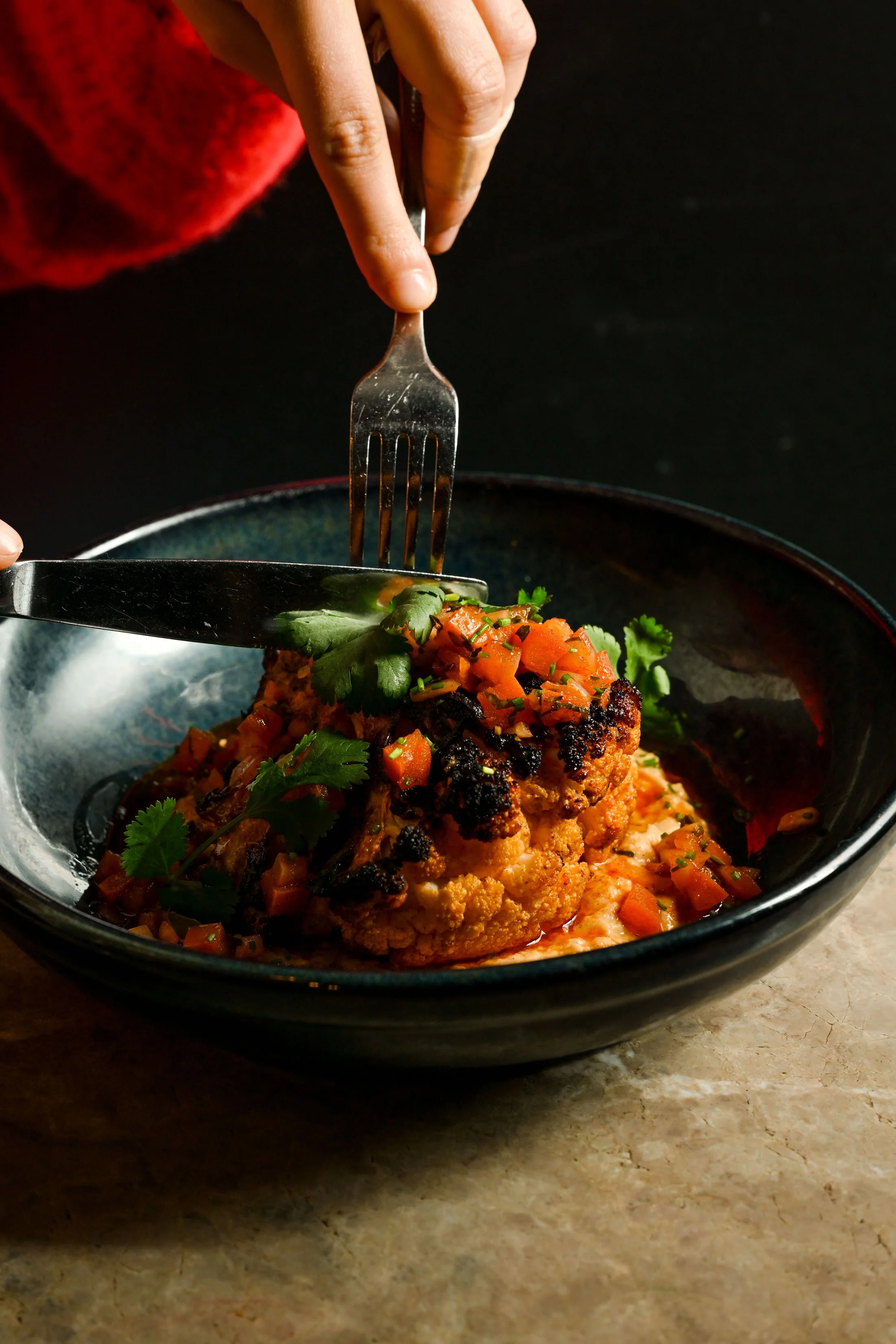 SMOKED CAULIFLOWER with red chimichurri & hummus.